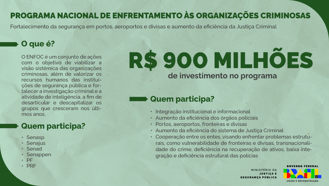 Com investimento de R$ 900 milhões, o ENFOC tem o objetivo de viabilizar visão sistêmica das organizações criminosas, valorizar os recursos humanos das instituições de segurança pública e fortalecer a investigação criminal e a atividade de inteligência, a fim de desarticular e descapitalizar os grupos, que cresceram nos últimos anos. Os recursos provêm do Fundo Nacional de Segurança Pública (FNSP), do Fundo Penitenciário Nacional (Funpen), do Fundo Nacional Antidrogas (Funad) e do Fundo de Defesa de Direitos Difusos (FDD), além de contar com financiamentos nacionais e internacionais, entre outros.
