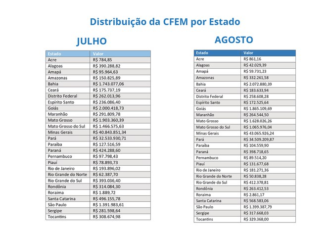 Os estados que mais receberam recursos da CFEM foram Minas Gerais (mais de R$ 83 milhões) e Pará (mais de R$ 67 milhões). Confira a distribuição por estado: