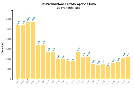 A taxa oficial de desmatamento no Cerrado é de 11.011,7 km² para o período de agosto de 2022 a julho de 2023. A estimativa é do sistema Projeto de Monitoramento do Desmatamento na Amazônia Legal por Satélite (Prodes), do Instituto Nacional de Pesquisas Espaciais (Inpe), e foi divulgada nesta terça-feira (28/11), em Brasília. O resultado representa aumento de 3% em relação ao período anterior, de agosto de 2021 a julho de 2022.