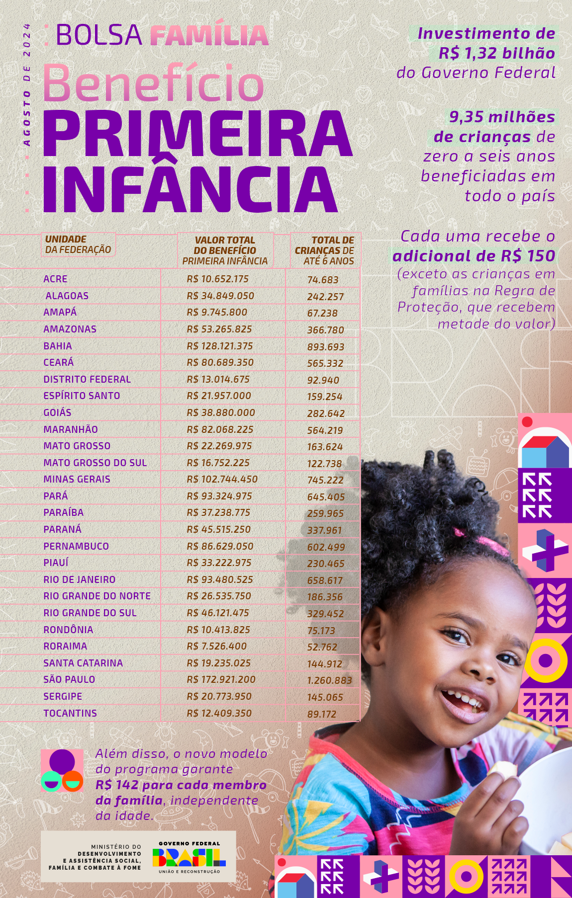 Em agosto, são R$ 1,32 bilhão em Benefício Primeira Infância (BPI) para mais de 9,35 milhões de crianças de zero a seis anos. Outros R$ 53,74 milhões são destinados para as famílias de 1,14 milhão de gestantes, enquanto R$ 19,65 milhões vão para as residências de 408,19 mil nutrizes.