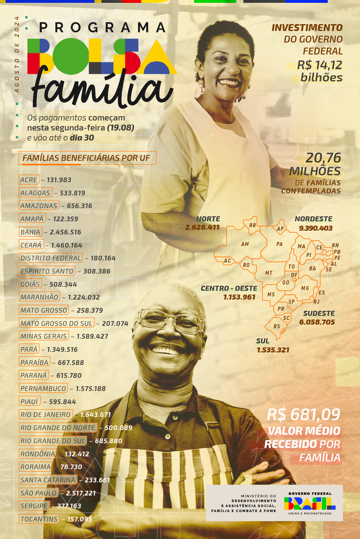 Os pagamentos de agosto do Bolsa Família começam nesta segunda-feira (19/8) para 20,76 milhões de famílias. O investimento do Governo Federal é de R$ 14,12 bilhões neste mês, o que dá um benefício médio de R$ 681,09. Com o foco na infância e adolescência, o programa alcança mais de 16,48 milhões de crianças de zero a 11 anos e 7,73 milhões de adolescentes de 12 a 17 anos. São 24,22 milhões de pessoas nessas faixas etárias, o que corresponde a 44,4% do total.