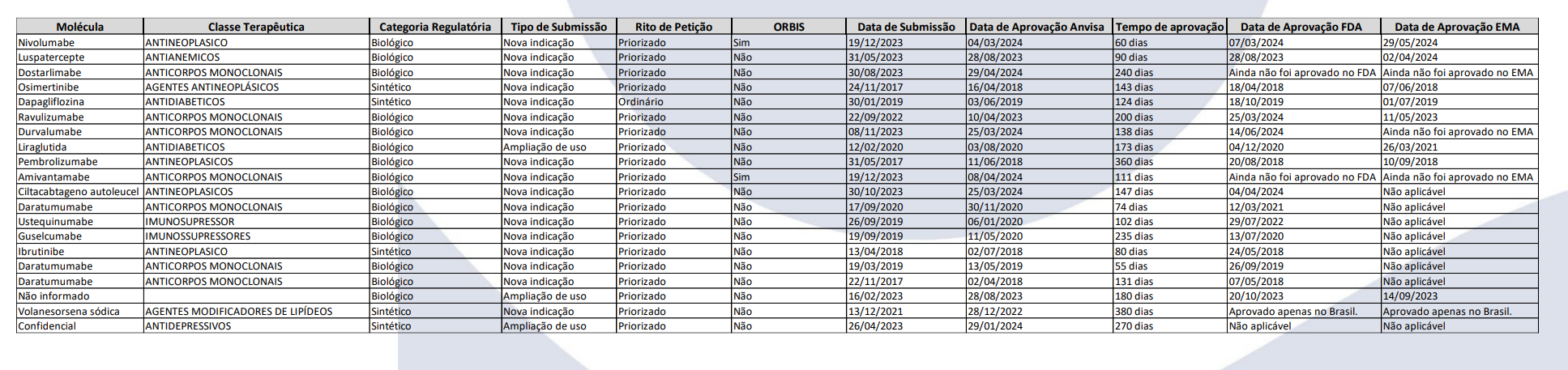 Durante o período de 25 de junho a 17 de julho de 2024, a pesquisa realizada com 38 empresas associadas à Interfarma revelou que a Anvisa concedeu 20 aprovações regulatórias pós-registro de segurança e eficácia mais rapidamente que as agências internacionais, incluindo inclusão de novas indicações e ampliações de uso, dentro do projeto ORBIS, sendo 25% destas para medicamentos sintéticos e 75 % dos casos para medicamentos biológicos.